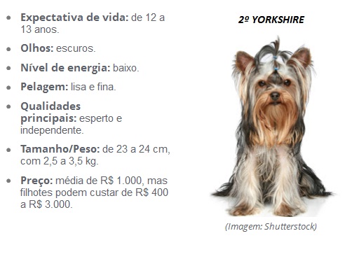 O Yorkshire é um cachorro alegre, independente e que pode ficar em apartamentos, visto que precisa de pouco espaço e se adapta a ficar sozinho durante um longo período. De cuidados especiais, necessita de banhos semanais devido à sua pelagem abundante.