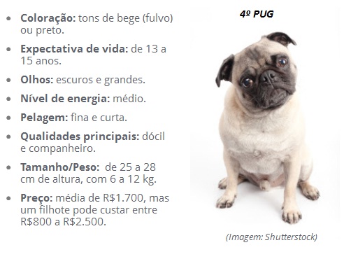 O Pug é uma das raças ideais para apartamento e está entre os 10 cães mais populares no Brasil. Os Pugs são extremamente dóceis, fáceis de cuidar e ficam quietos na maior parte do tempo. Apenas evite deixá-los muito no calor, pois possuem o focinho mais fechado e podem ter dificuldades de respiração.