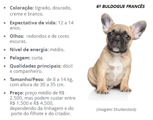 O Buldogue Francês é um ótimo cão para companhia, que necessita de poucos cuidados, com destaque para deixá-lo longe de calor excessivo. É um cão para apartamento e necessita de muita atenção, então procure não deixá-lo sozinho e encha-o de mimos porque é muito dócil.