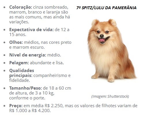 O Spitz é uma das raças preferidas no Brasil e também é ideal para apartamento. Isso porque ele não precisa de espaço, mas, em compensação, precisa de muito carinho e detesta ficar sozinho. Ele é ótimo cão para companhia e muito fiel ao seu dono, sendo até bravo quando pressente o perigo, mesmo sem ter tamanho para isso.