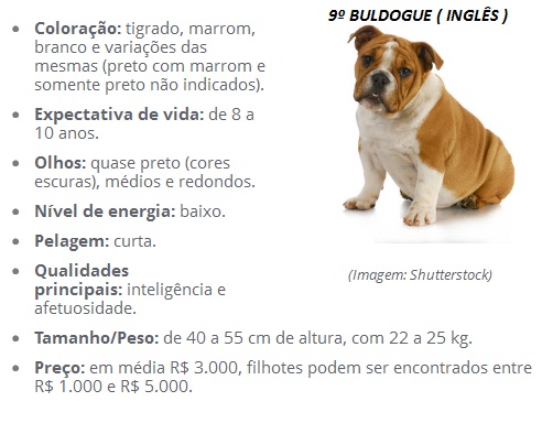 O Buldogue ou Buldogue Inglês (linhagens mais antigas) é ideal para apartamentos, pois não faz muito barulho, porém se você é do tipo que sai bastante, não escolha um Buldogue, pois ele quer sempre estar em companhia e pode ficar depressivo.