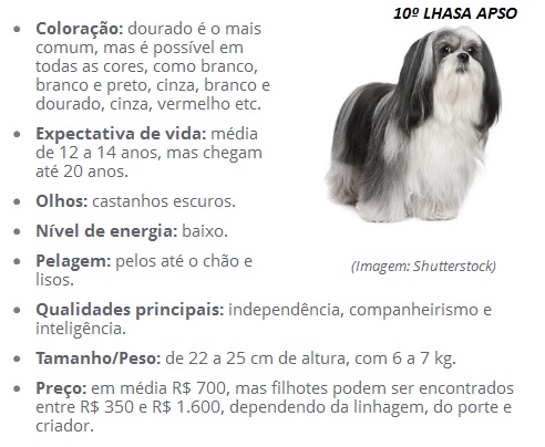 O Shih Tzu está entre os mais queridos entre os brasileiros e adapta-se facilmente em apartamentos. Adora brincar e é bastante companheiro. Precisa de banhos com frequência e os cuidados com escovação devem ser diários. Ele é independente e pode ficar
